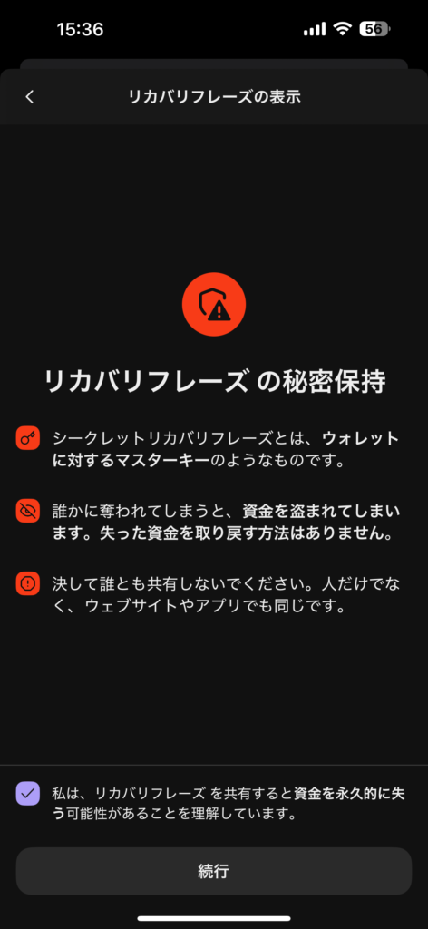 【最重要】シークレットリカバリーフレーズについて 画面に表示される12個〜24個の英単語。 これがあなたの「全財産」を守る鍵です。 ・絶対にスクショを撮らない(スマホが乗っ取られたら終わります)。