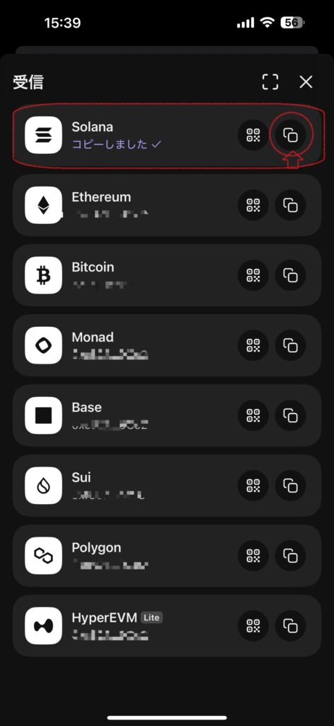 Phantomアプリを開き、画面上部の「アカウント名(Wallet 1など)」をクリックすると、複雑な英数字のアドレスがコピーされます。 これがあなたの「銀行口座番号」です。