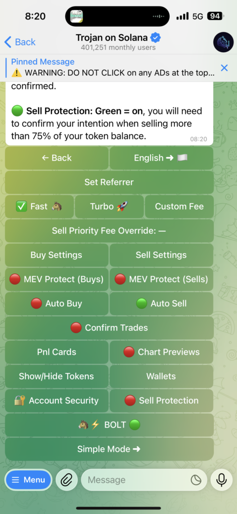 しかし、この恐怖のサンドイッチ攻撃は、たった一つの設定で防げます。 私が使っているBot「Trojan on Solana」の設定画面を見てください。