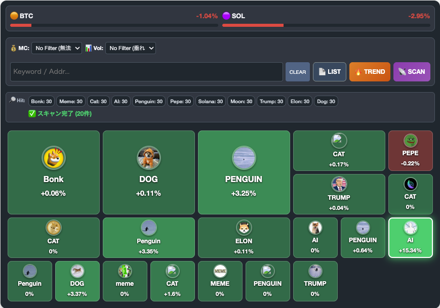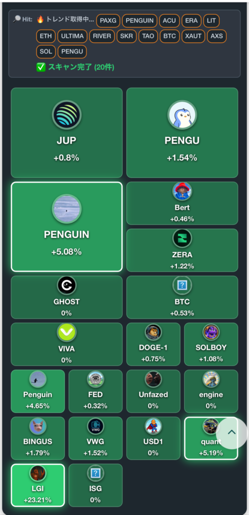 ↑見てください、このBloombergターミナルのような画面。 左上にドカンと鎮座する主役コインと、右下で怪しく光る急騰コイン。これが見たかったんです。